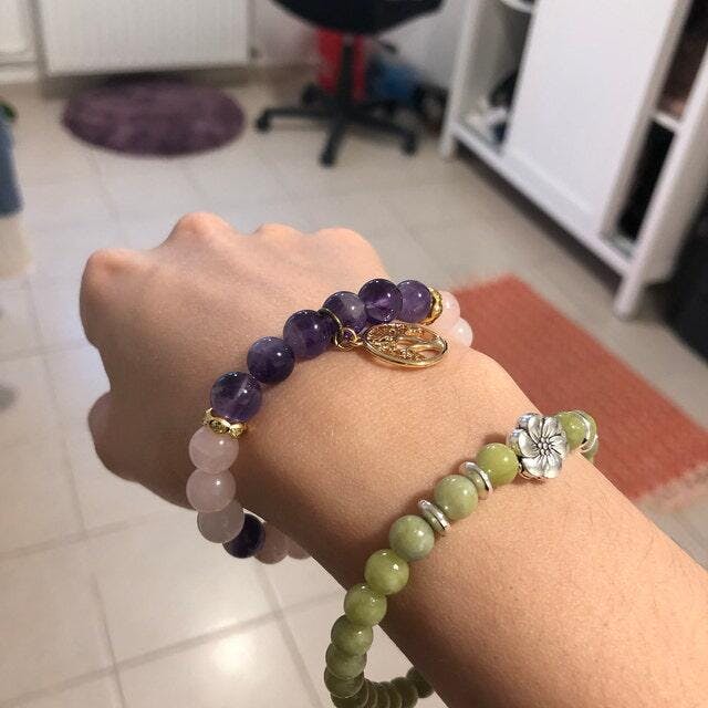 Bring harmony and elegance to your outfits with the Cherry Blossom Bracelet in natural Jade stones , a handcrafted piece of jewelry that combines beauty, refinement and symbolism.